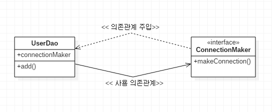 UserDao 오브젝트는 이제 생성자를 통해 주입받는 DConnectionMaker 오브젝를 언제든지 사용하면된다.